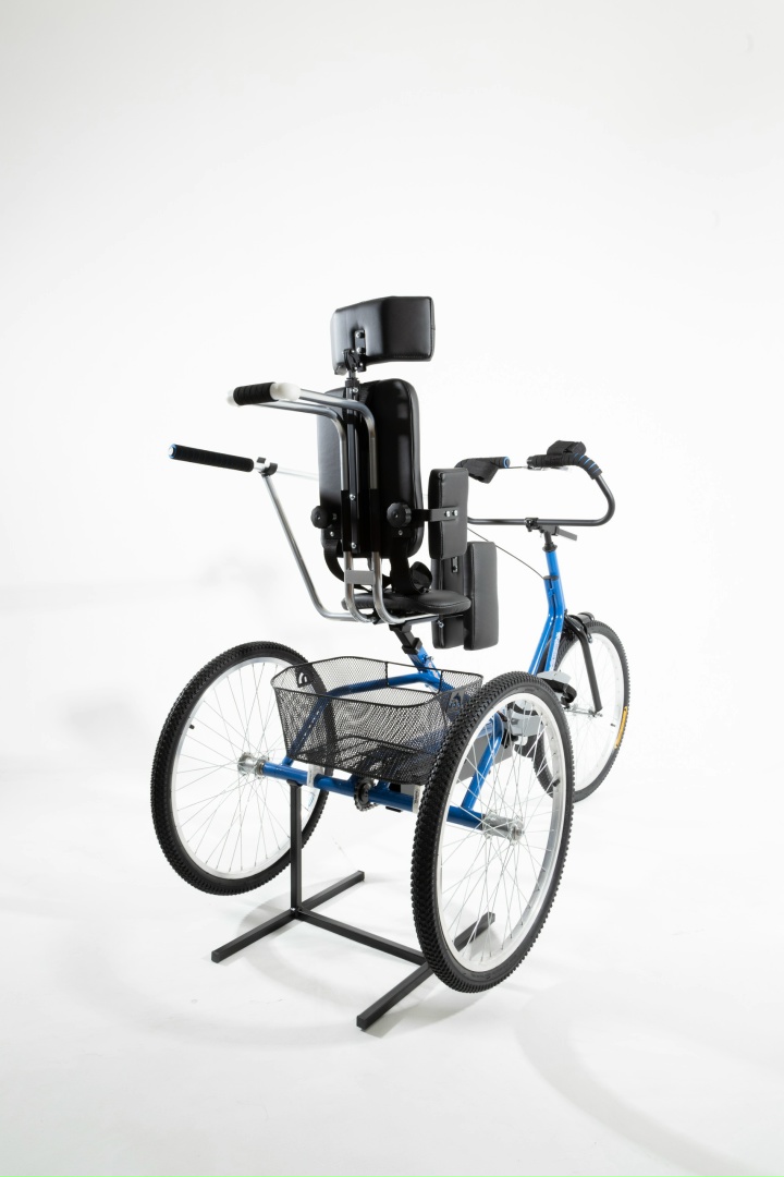 Специализированный трехколесный велосипед имеет ножной привод. Принцип движения колёс: одноосевой. Привод осуществляется на одно заднее колесо. Задние колёса установлены широко для устойчивости и безопасности. Цепь надёжно закрыта кожухом во избежание травматизации. Рама включает в себя площадки под стопу с задними и передними съёмными тросиками -стабилизаторами для удержания педалей в правильном положении во всех фазах движения. Крепления стоп имеют текстильные ремешки, фиксирующие стопу во всех плоскостях. Передаточное число низшей передачи обеспечивает лёгкое вращение педалей для начинающих и позволяет ездить только на безопасной скорости. Задняя ось встроена в раму, что определяет меньшее сопротивление при занятиях на подставке дома. Велосипед имеет регулируемые по высоте: спинку, сидение, руль с амплетудой вылета до 15 см. Руль может закрепляться под нужным углом. Вынос руля позволяет регулировать расстояние вытянутой руки, а широкое специализированное сидение более адаптировано под велотренажер. Конструкция рамы имеет более удобную, низкую и комфортную посадку. Стояночный тормоз фиксирует оба задних колеса. Сборка осуществляется с помощью комплекта инструментов. Для достижения более удобной и быстрой транспортировки модель имеет съемные задние задние и передние колеса. С велосипедом поставляются руководство пользователя и гарантийный талон. Трехколесный велосипед можно использовать как стационарный тренажер для ног в домашних условиях, так и на улице. Велосипед-тренажер для детей больных ДЦП изготавливается по индивидуальному заказу, под точный рост ребёнка и длину ноги ребенка от паха до пятки. Это делается для того чтобы он прослужил Вам как можно дольше.